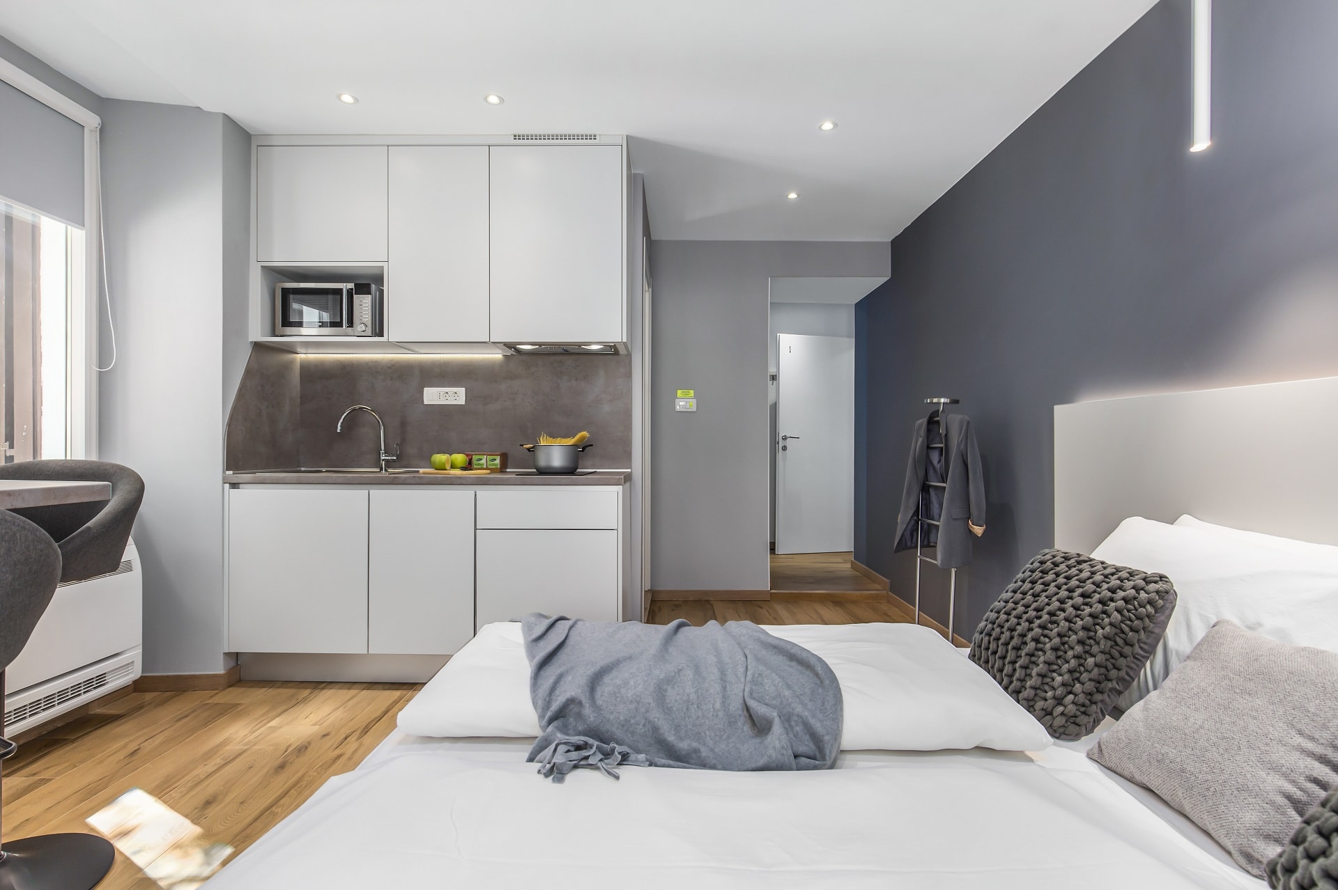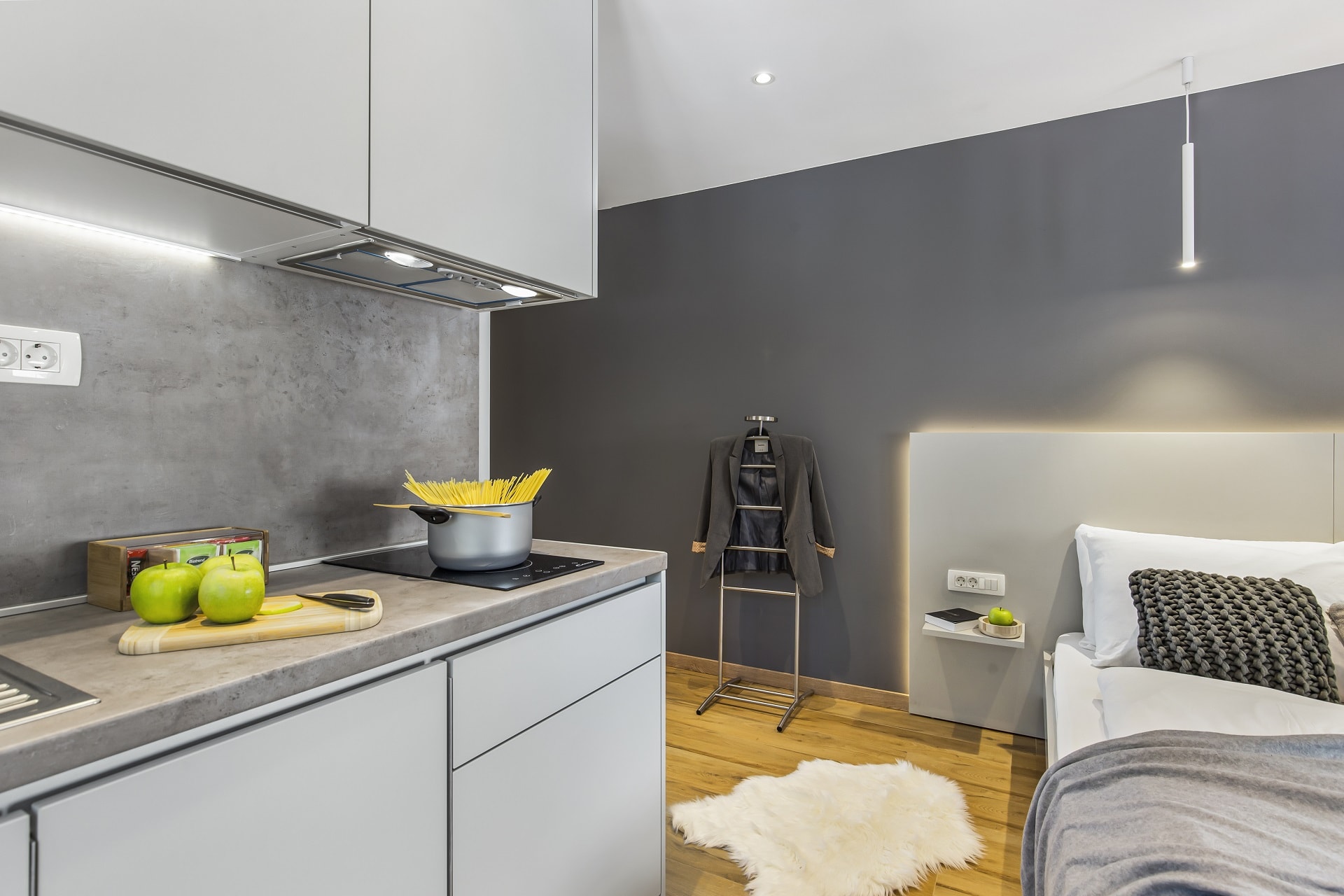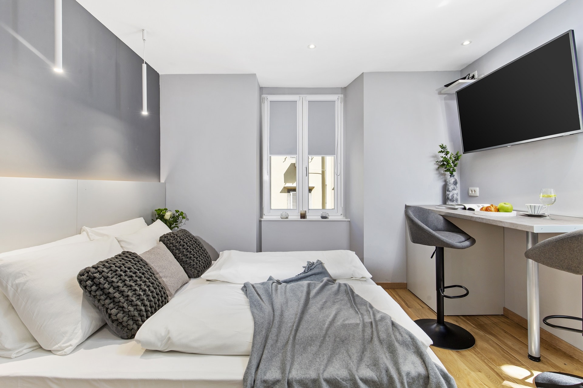 Private apartment in the building, socket near the bed, clothes rack, streaming service (Netflix - option), pay-per-view channels, android smart ambient light flat-screen TV, IPTV (MaxTV) channels, Tea/Coffee maker, kitchen, refrigerator, microwave, Kitchenware, electric kettle, dishwasher, stovetop, dining table, upper floors accessible by stairs only, air conditioning, soundproof, private entrance, ironing facilities, iron, heating, wardrobe or closet, sitting area, dining area.
